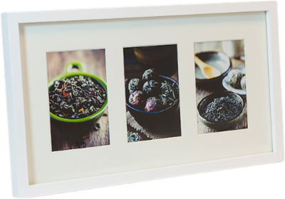 Hvit trelist med passepartout for 3 bilder. Kan henges på vegg eller stå løst.